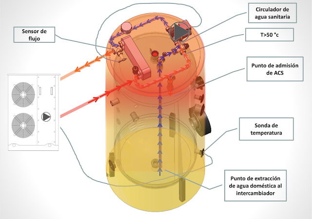 El intercambio térmico se produce a través de un intercambiador de placas situado en el módulo de intercambio ubicado en la parte superior del depósito, que también incorpora bomba de circulación, sensor de flujo y válvula termostática mezcladora para la optimización del calentamiento y estratificación.